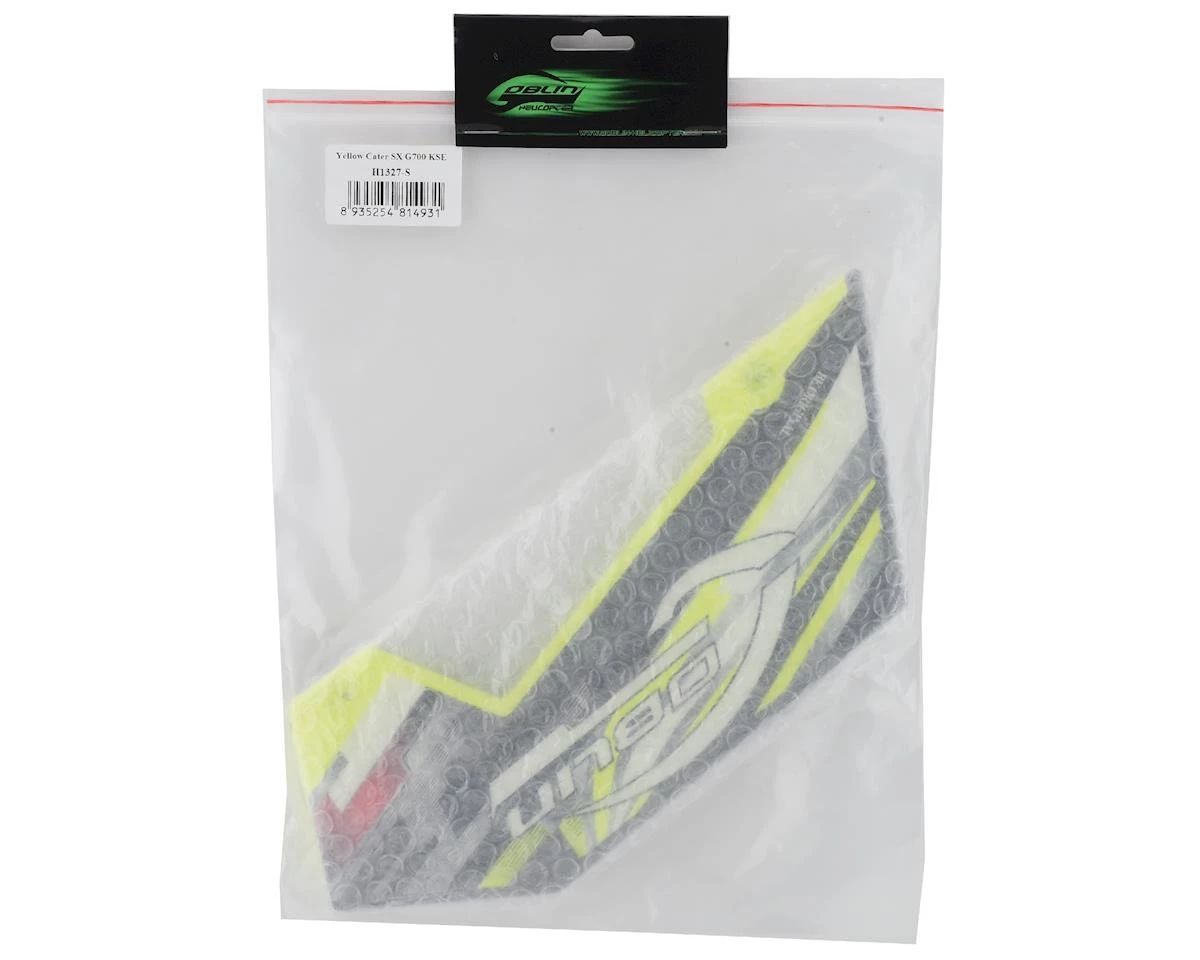 This is a SAB Low Left Side Frame Carter, suited for use with the Goblin Kraken 700 helicopter. Featuring a yellow and black livery.